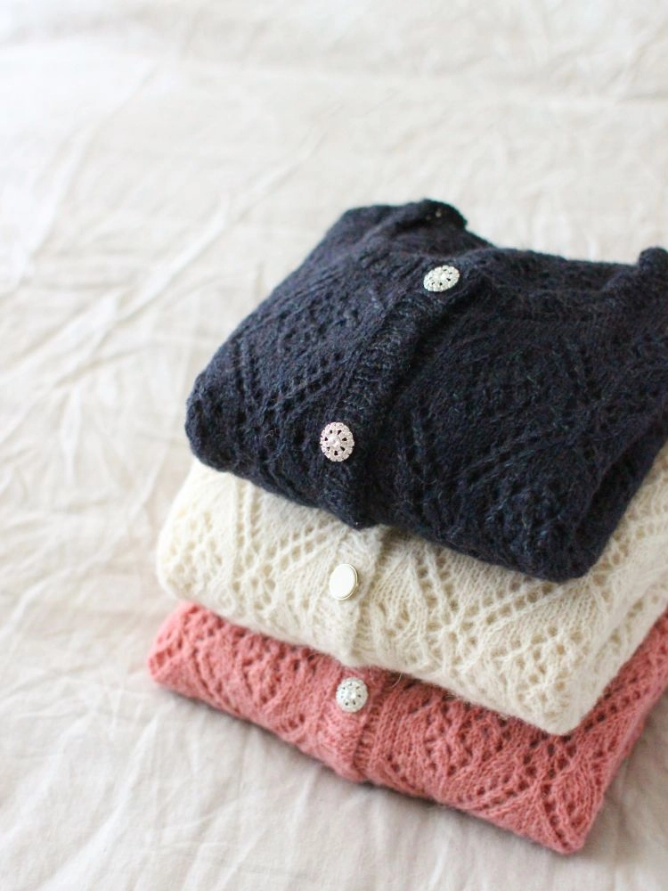 뒤판, 앞판, 소매를 각각 뜬 다음에 돗바늘로 이어주고 앞섶과 목둘레에서 코를 주워 버튼 밴드와 넥 밴드를 만들어 줍니다.