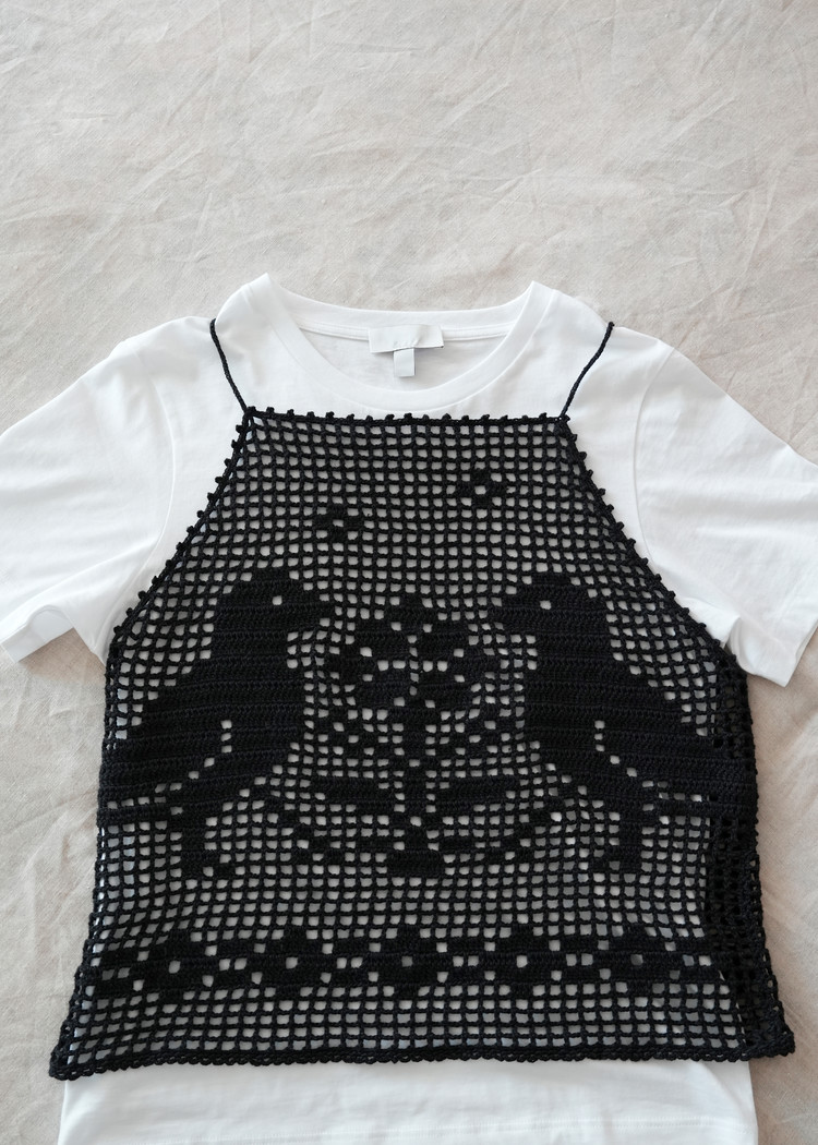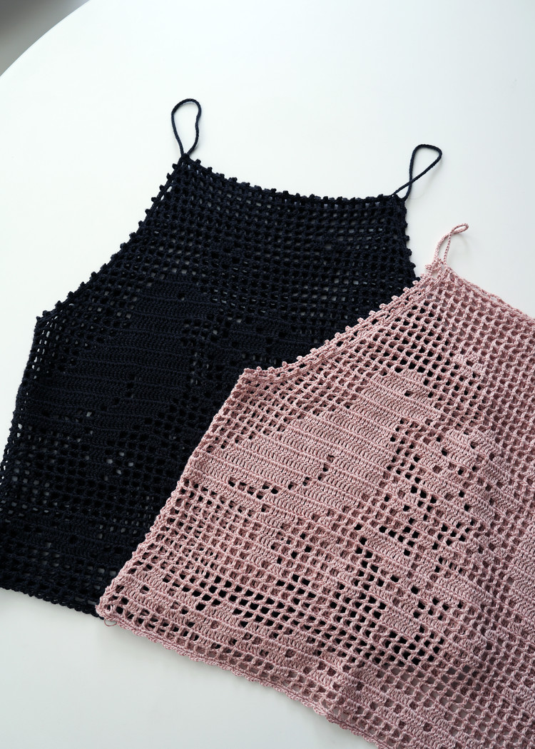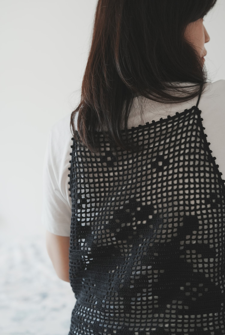 Worked from the top down in breathable linen- or cotton-blend yarn, it’s both comfortable and structured — perfect for warm-weather wear or as a chic layering piece. The front and back feature different motifs, allowing you to wear it either way depending on your mood. Because the entire piece is worked in filet mesh, adjusting the width and length is simple by adding or removing mesh repeats.